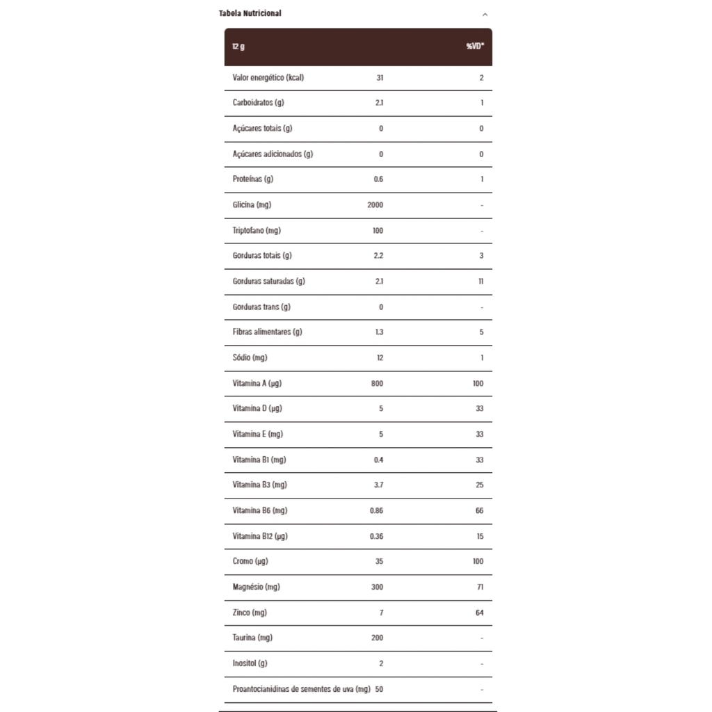 Triglicerídeos de cadeia média C8 + C10 (TCM), glicina, inositol (mio-inositol), cacau em pó alcalino, carbonato de magnésio, inulina obtida da raiz de chicória, taurina, L-triptofano, sais de magnésio do ácido cítrico, extrato seco de semente de uva, acetato de DL-alfa-tocoferila (vitamina E), complexo de vitaminas B (tiamina (vitamina B1), nicotinamida (vitamina B3), piridoxina (vitamina B6), cianocobalamina (vitamina B12)), bisglicinato de zinco (zinco quelato), acetato de retinol (vitamina A), picolinato de cromo, vitamina D3 (colecalciferol), espessantes: goma acácia e goma xantana, edulcorante glicosídeos de esteviol de Stevia rebaudiana Bertoni e aromatizantes.